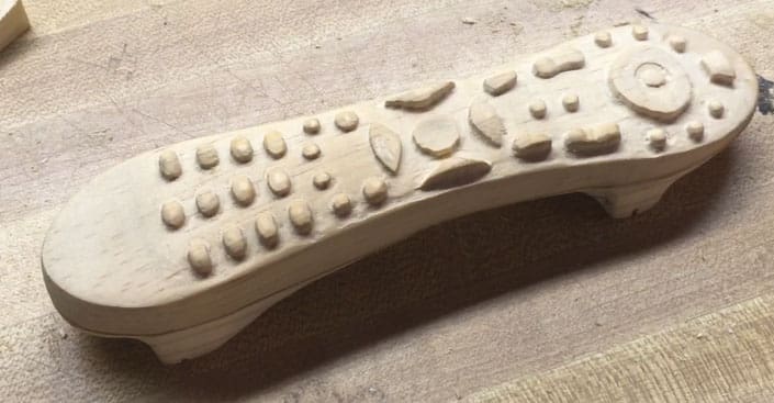 That started our journey down a very interesting path… To make a long story short… We turned to the CarveWright. He setup the scanning bed and laid down the actual remote control. Scanned it. Then together we made a few corrections in the scan result, resized the design to the regulation requirements, and then he loaded the wood into the CarveWright and carved it to model the remote sitting on the counter that night. He then sanded his block of wood and painted it to match, with some help on the details and adult guidance of course.