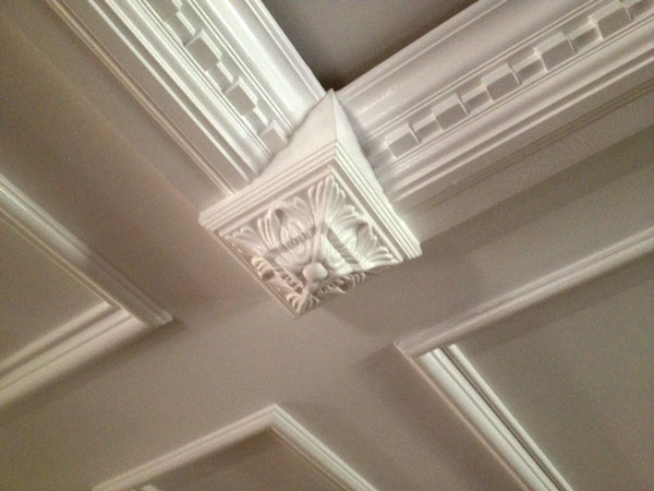 Since I would be painting these, I used 2″x6″ construction grade pine from the local HomeDepot and they carved perfect using the 1/8″ long carving bit. I needed 4 per ceiling section which ended up being 16 total. Once carved, I sanded with a 180 grit sanding mop, primed, sanded some more and then painted them.