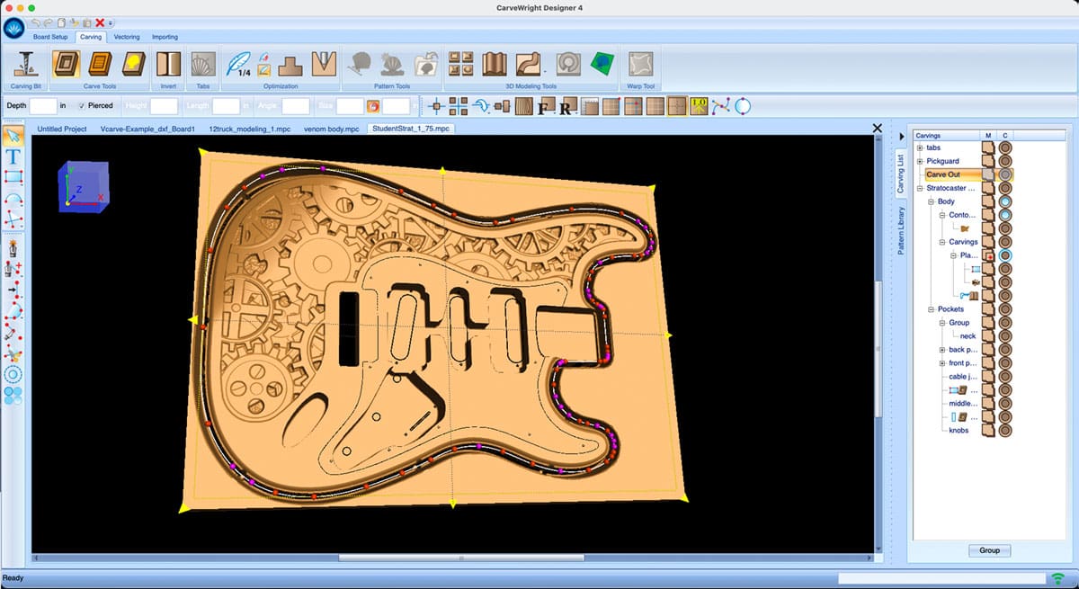 Designer allows for 2D and 3D carving right out of the box. Just arrange your design on the screen how you want it to carve and then upload. It automatically compiles the project without any programming decisions so you can take it to the machine and carve.