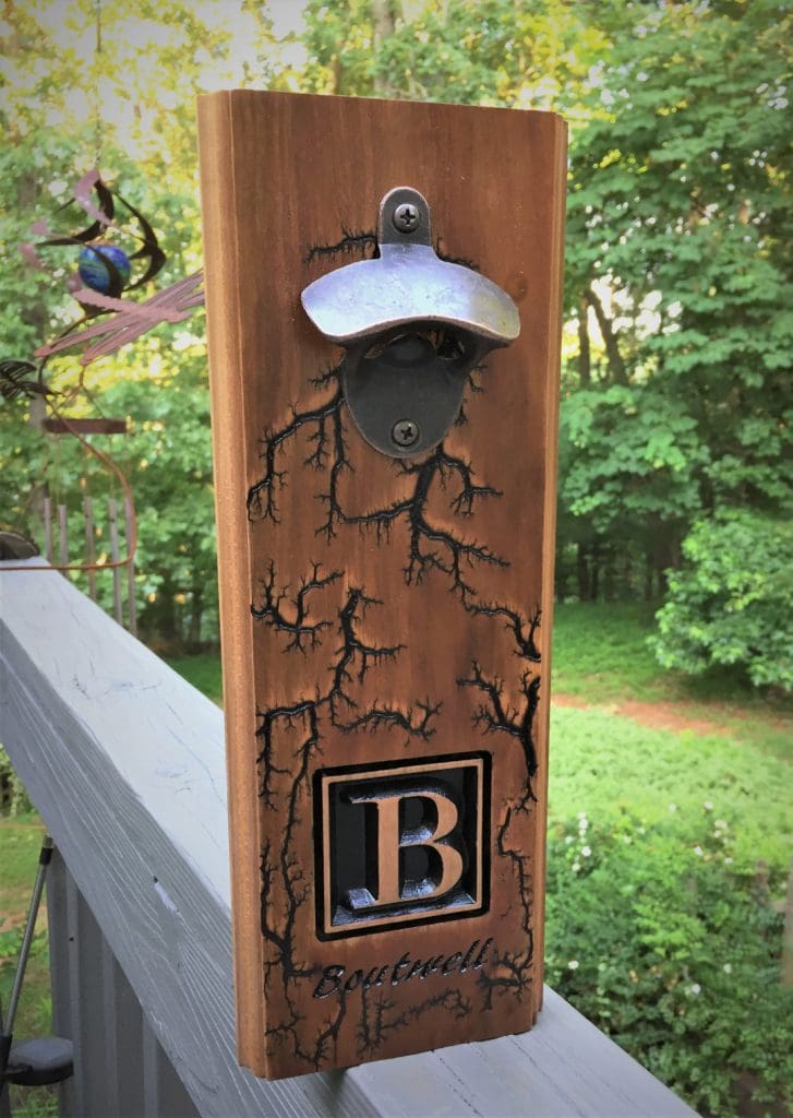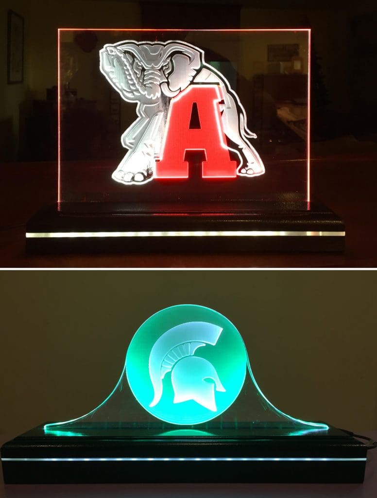 Then, inspired by what he saw on the Community Forum, his projects slowly grew more complex. He began working with acrylics, first a lithophane and now takes many orders for his colorful side lit acrylic signs. He is even experimenting with adding electrified wood in some of his carving projects.