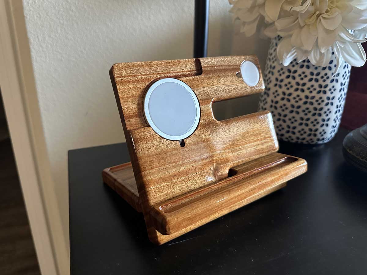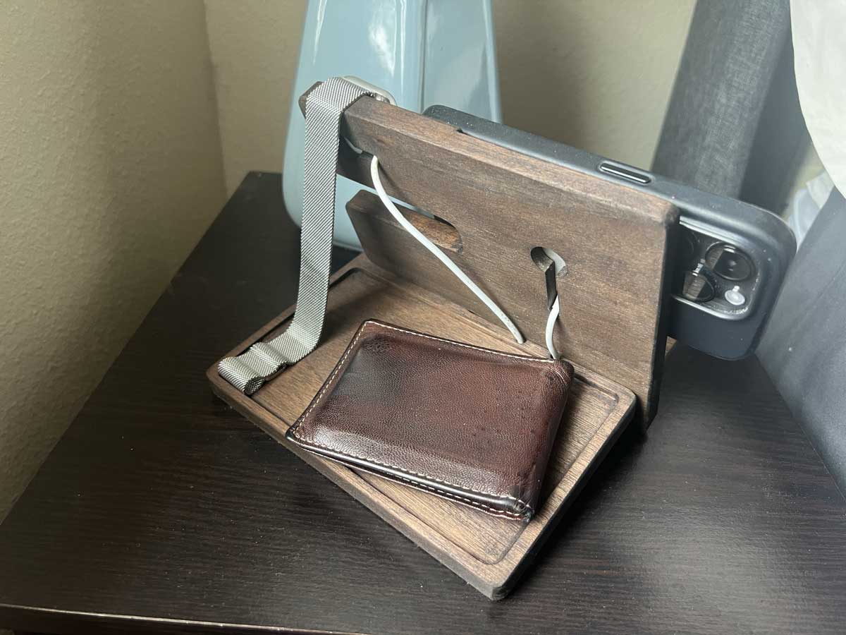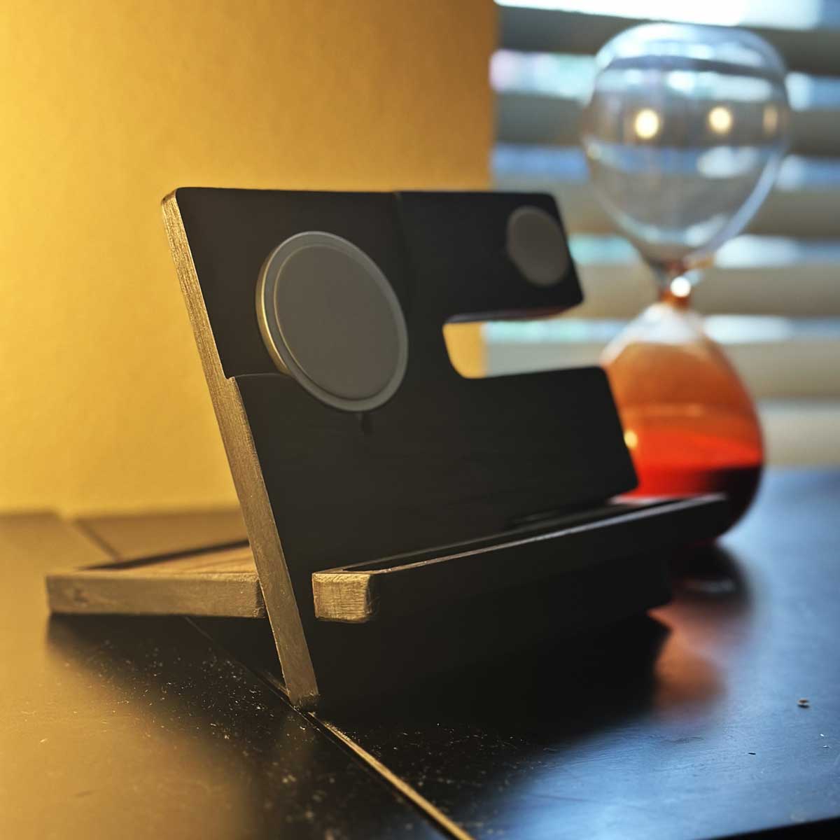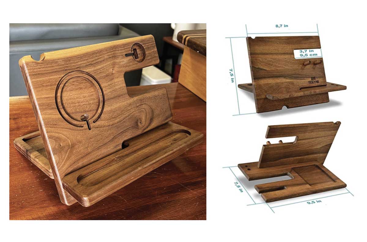 The charging dock was inspired by similar products I’ve seen on Etsy and other sites. The interlocking pieces fit together perfectly to make it stand and it has places to store your things.
