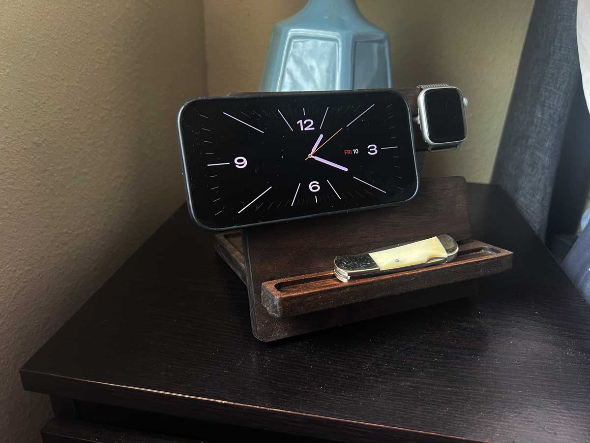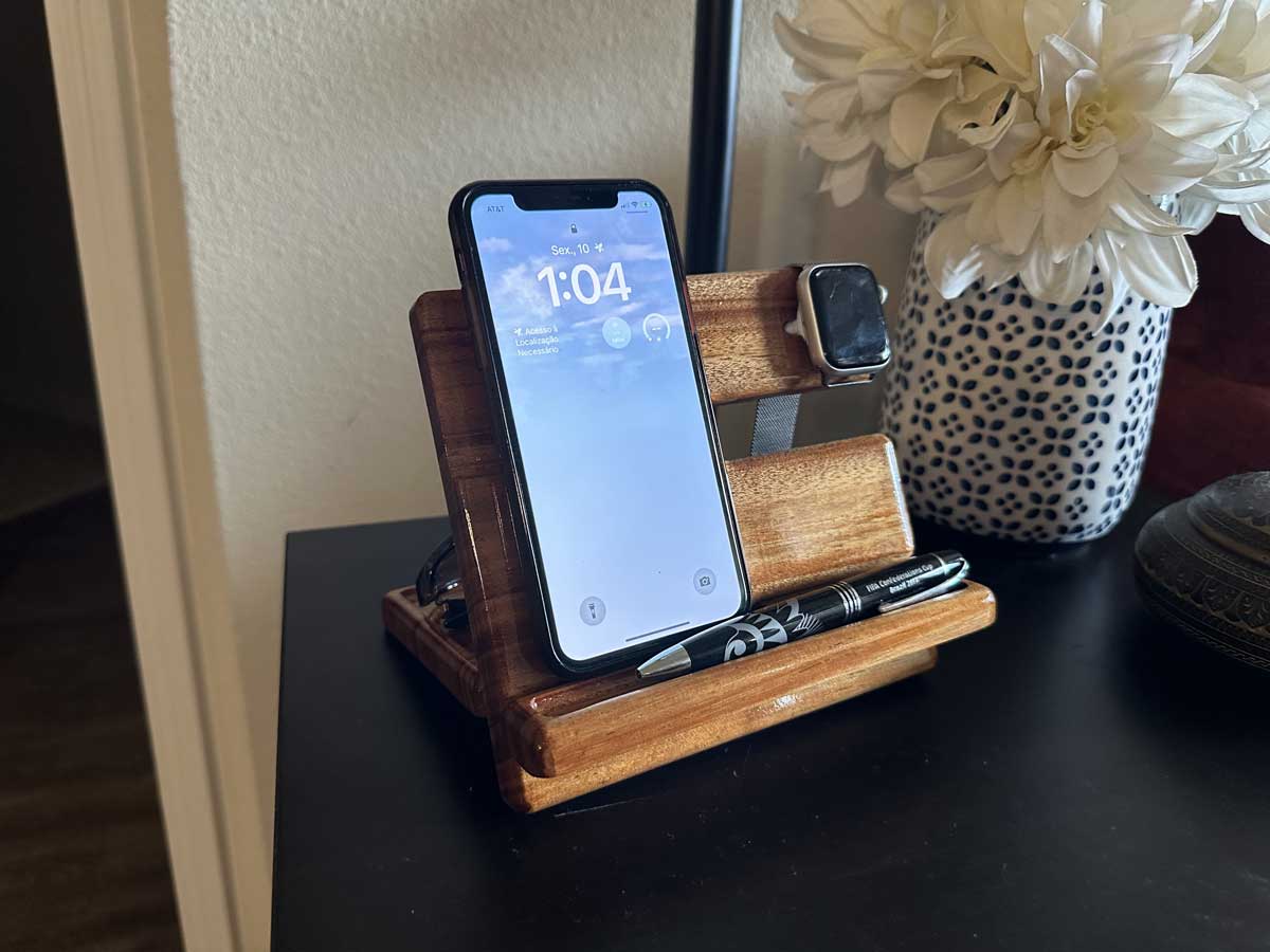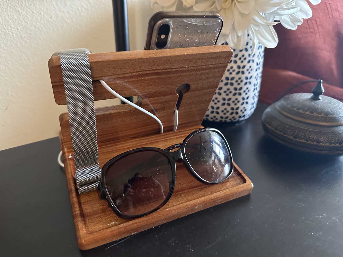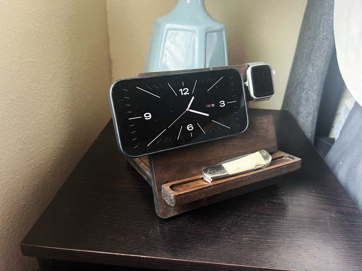 The charging dock was inspired by similar products I’ve seen on Etsy and other sites. The interlocking pieces fit together perfectly to make it stand and it has places to store your things.