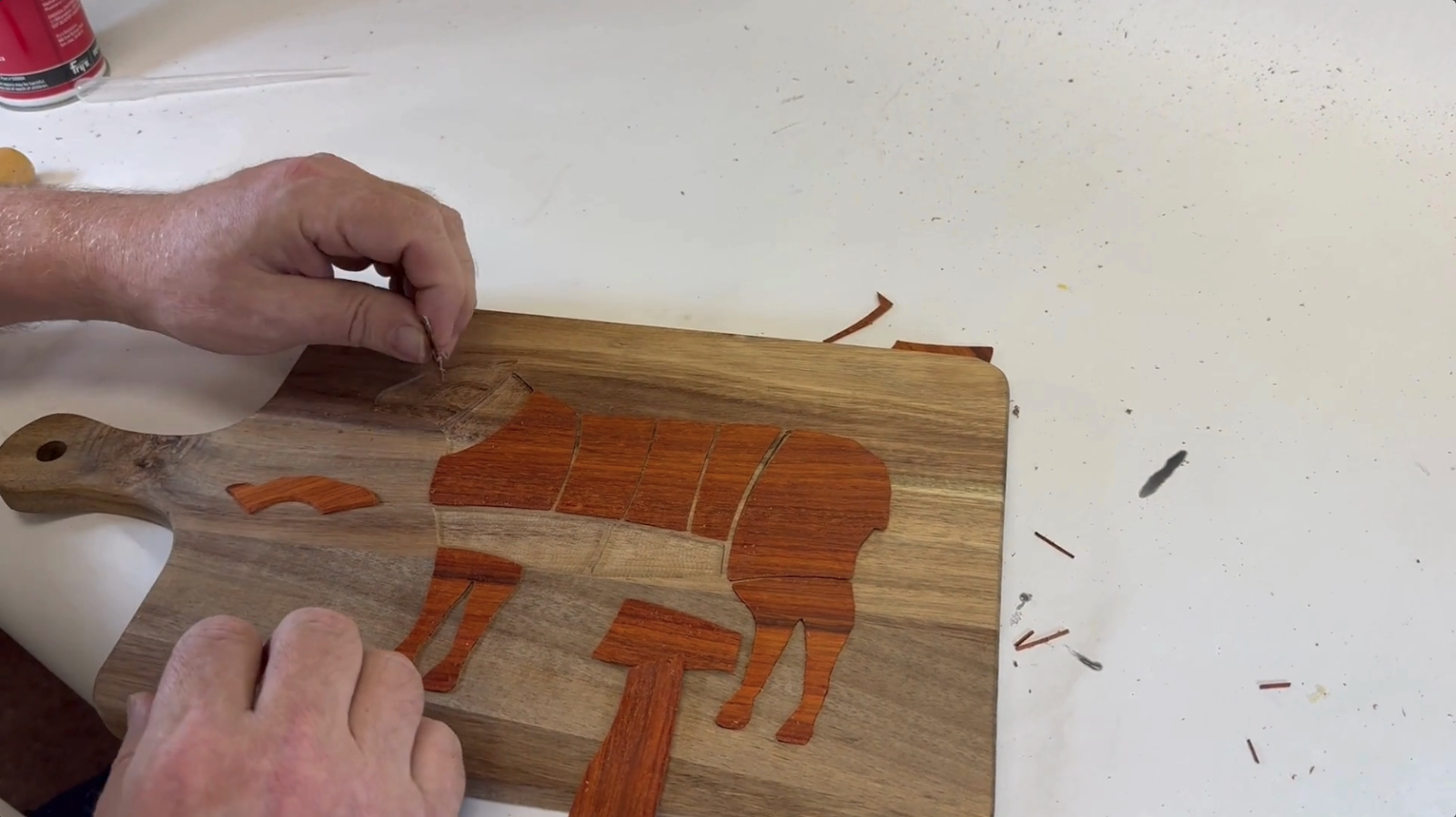 • Fit the inlay pieces into the base material. The parts should fit in with only a little material standing above the base material. If a part is not fitting down into the cavity look for spots that need to be chiseled out more or where the edges need to be cleaned better.
