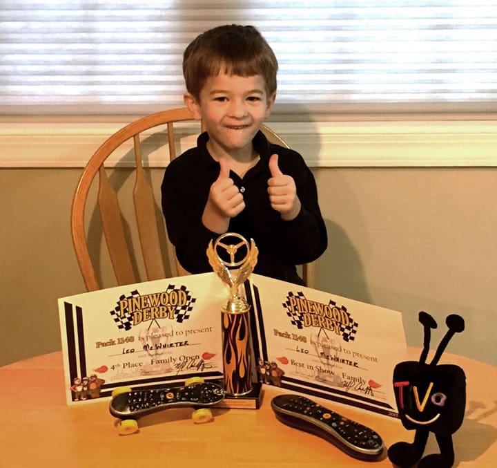 Wanted to drop a note of thanks. My oldest son (7yrs old) is in Cub Scouts and last weekend we had our Troops Pinewood Derby races. We started to prepare about 2 months ago and my youngest son (almost 4yrs old) wanted to participate as well. He was looking for ideas to design his car and found his design motivation from Tivo! We had the stock block of wood sitting on the kitchen counter while we discussed design ideas. It just so happened, nearby was one of our Tivo remotes. He LOVES our Tivo’s! He quickly grabbed the remote and placed it next to the block of wood. Comparing them, he noticing they were similar in size and shape. The gears started turning in his little thoughts and he then asked with great excitement and enthusiasm, could we carve his race car as a Tivo remote?