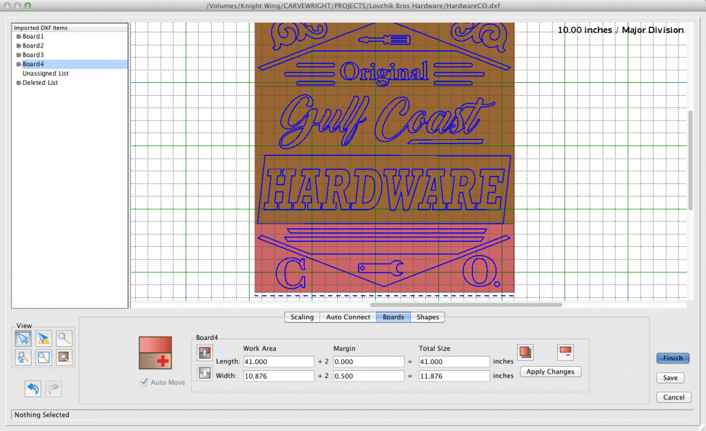 I used the DXF Importer to bring my design in, size it, and separate the pieces into individual boards.