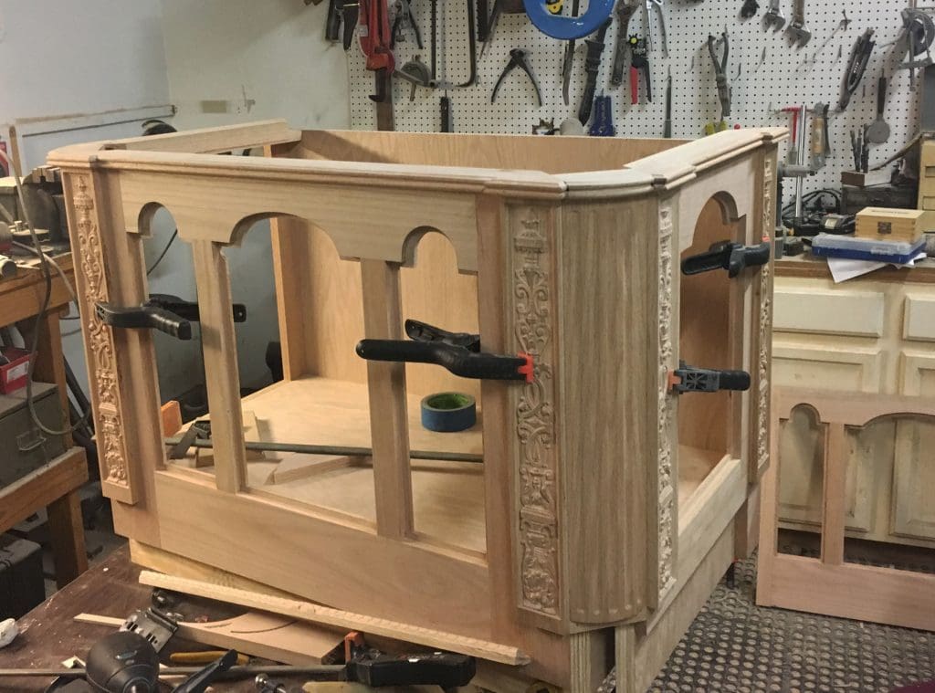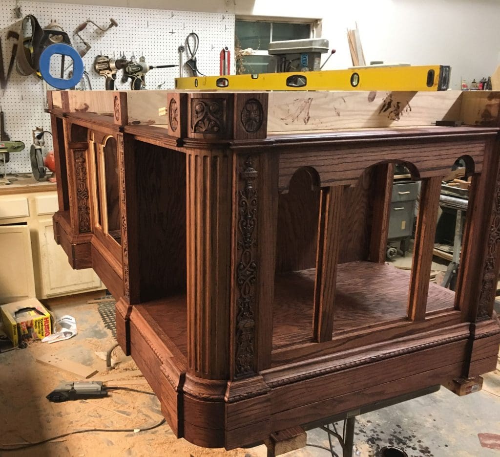 After all the pieces were carved and cut, the building process began. The desk is basically made up of two pedestals, a middle section that bridges them together, and the desktop.