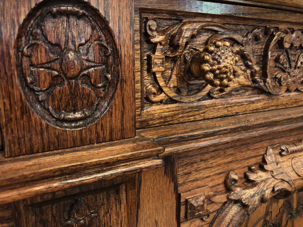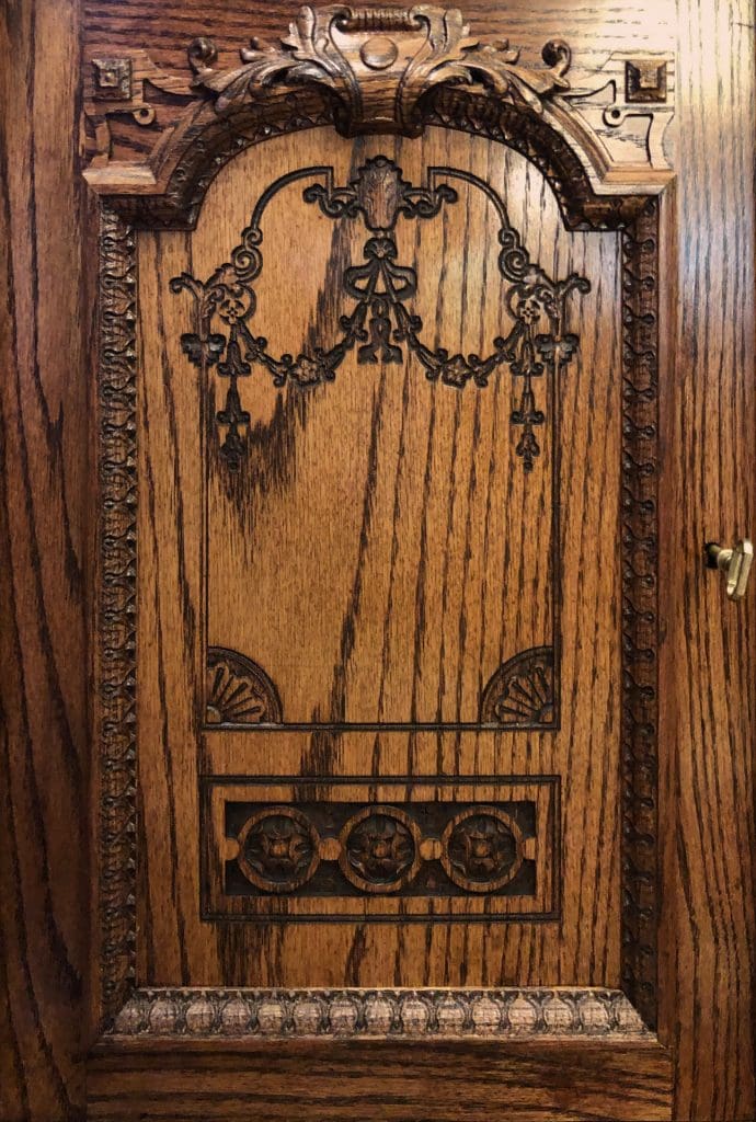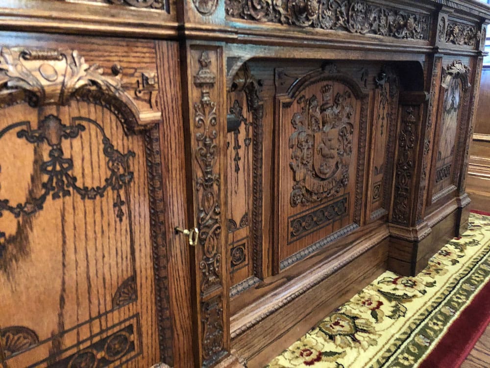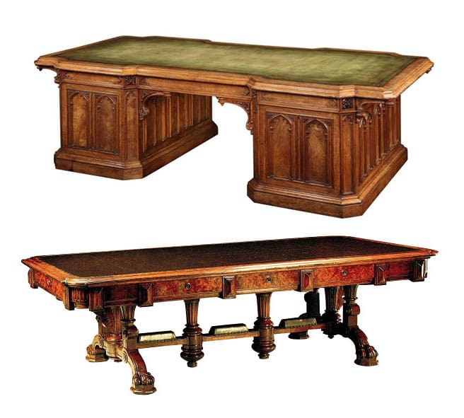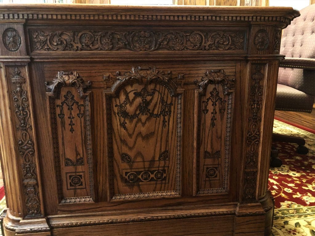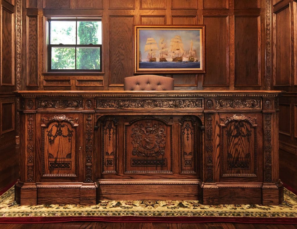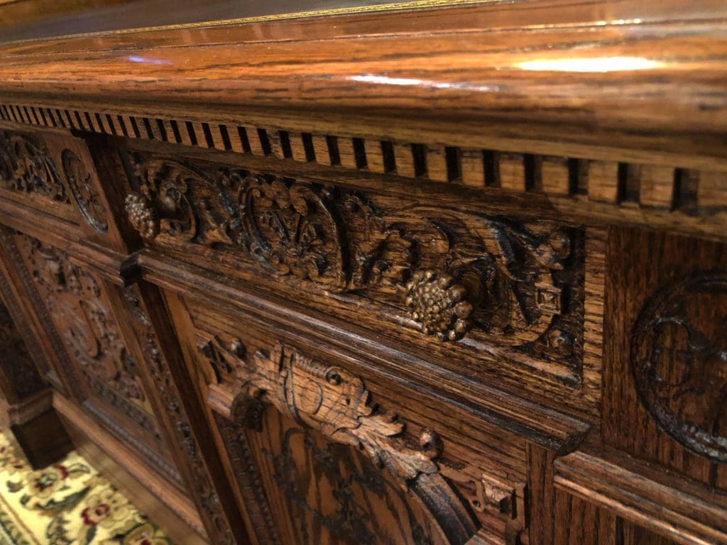 The library bookcases and paneling with all the detailed carvings were completed a couple of years ago, but this didn’t finish the room. It still needed to be furnished. Trying to find furniture for this room isn’t easy. For one, it’s a large room, and two, the pieces need to fit stylistically within the space. To start, we knew we needed an impressive desk, so on to google we went to do some research.