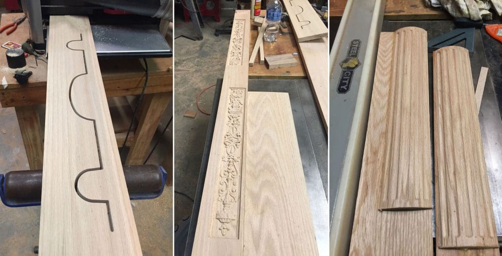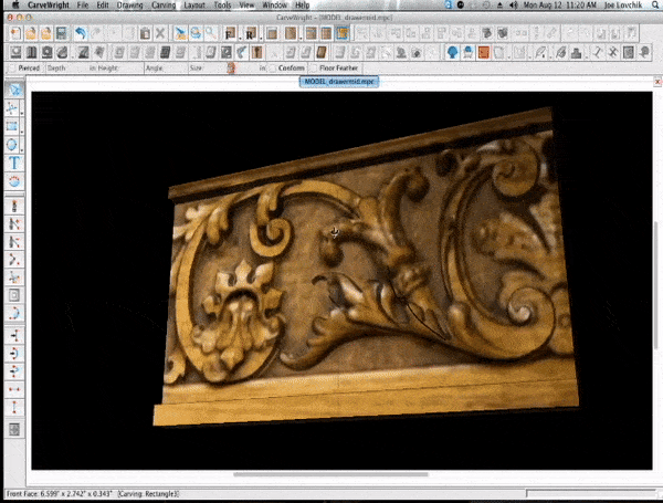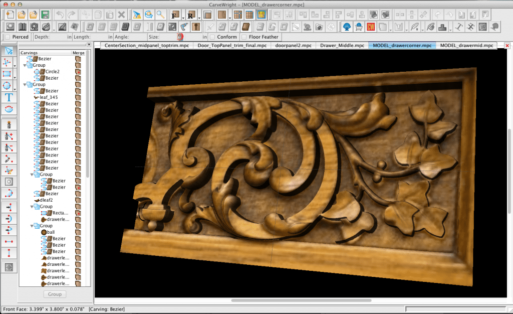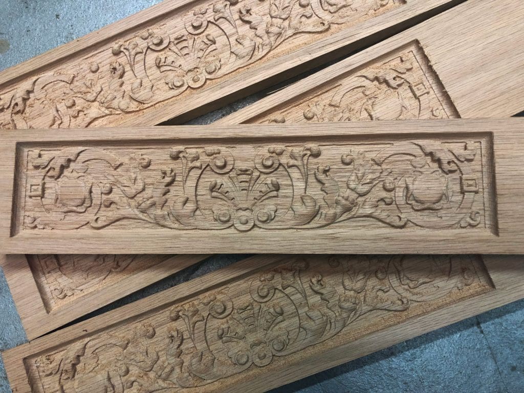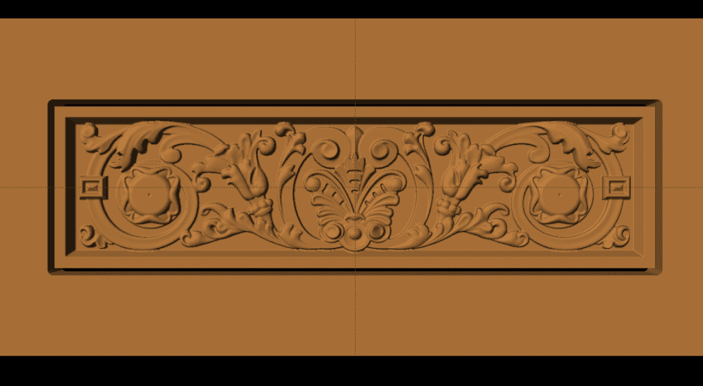 We found some plans for the desk online, and it was helpful in defining sizes, but ultimately it wasn’t detailed enough for much more. The trickiest part of this project was replicating the carvings. None of the 3D models for this desk existed yet, so we had to create all of it from scratch. Pattern modeling is meticulous work and can take a lot of time, so we split up the work between us and hired Michael Tyler at CarveBuddy.com to help make some of these. Utilizing the tools available in the Pattern Modeling Suite, Vector Drawing Suite, and Pattern Sculptor, we were able to create the entire set of 3D patterns we needed.