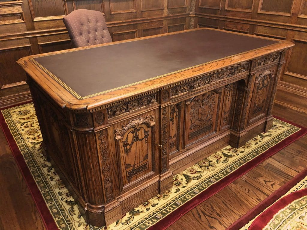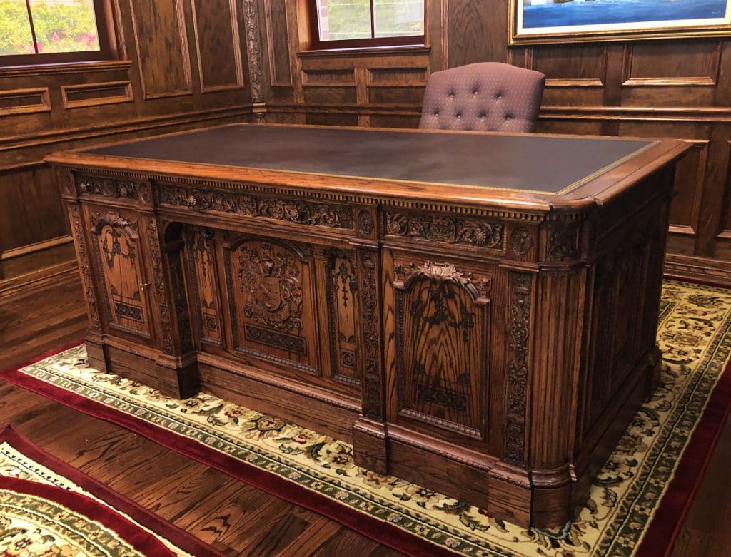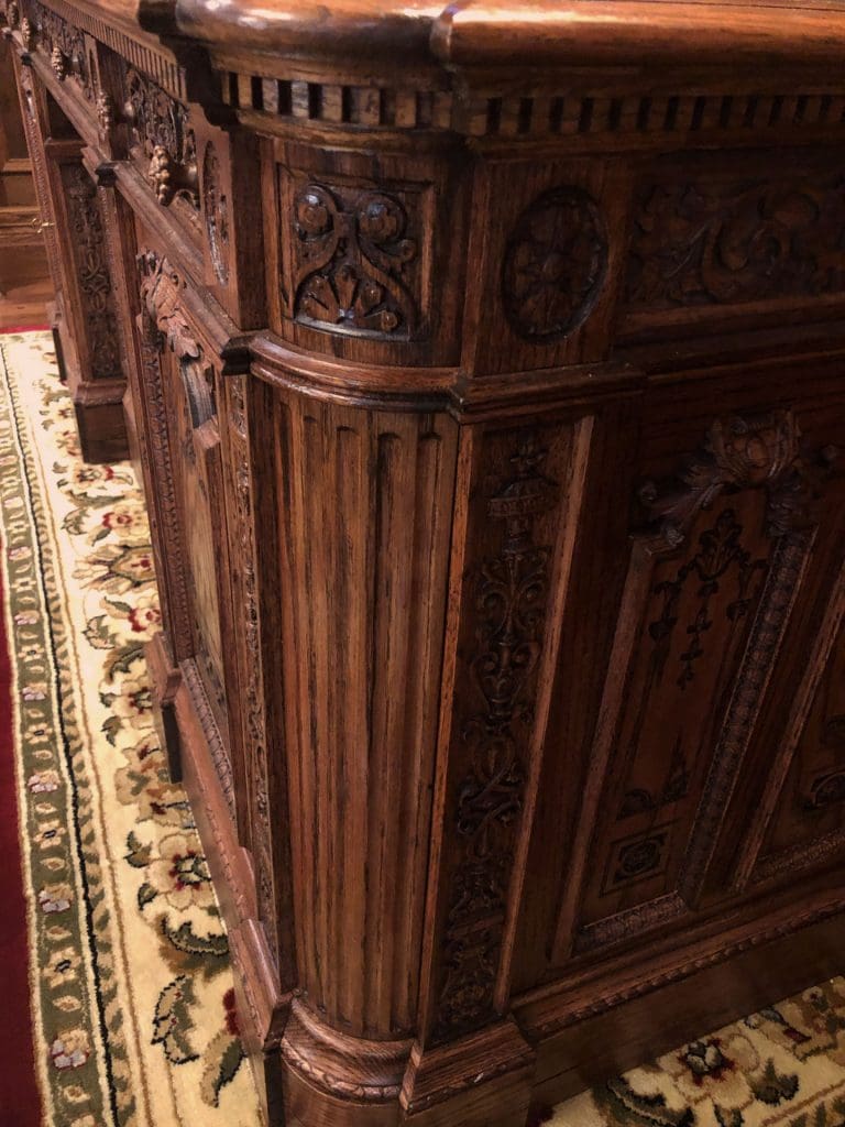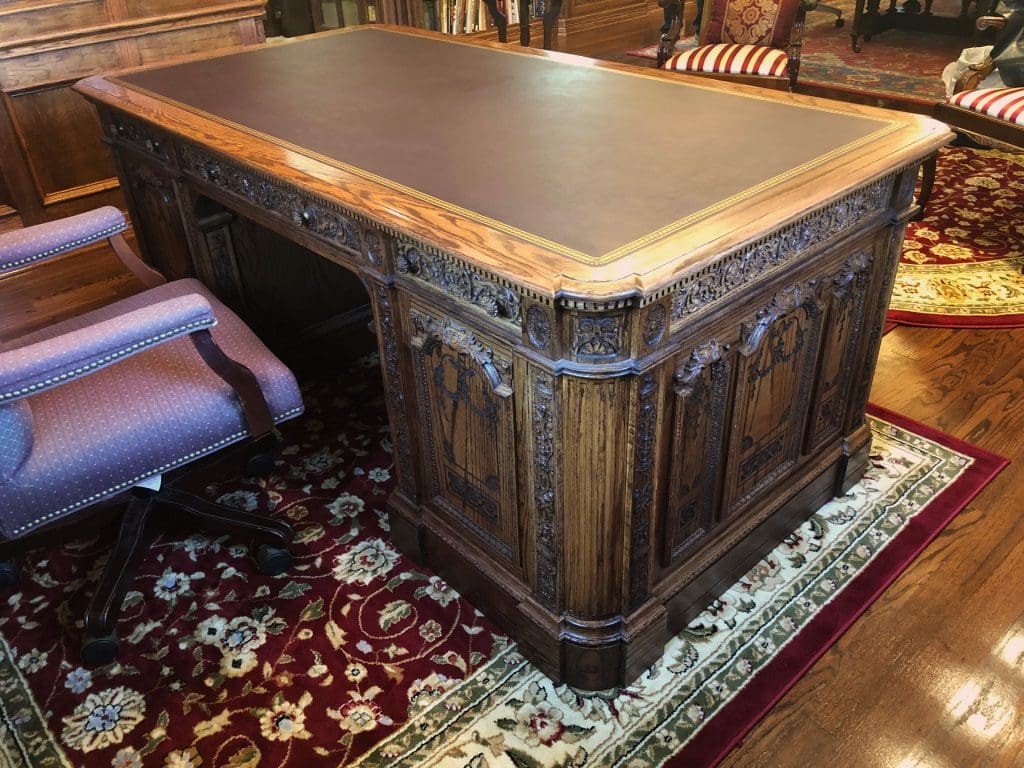 We found several desk ideas, but we kept going back to one that seemed to embody everything we were looking for. It was The Resolute Desk that sits at in the Oval Office. Once we learned the backstory of this desk being made from the timbers of a recovered British ship that had been lost in the Arctic, we were fully sold. You can learn the amazing story of the Resolute here on Wikipedia.